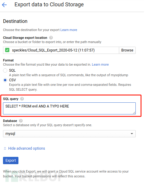 该漏洞由研究员Ezequiel Pereira发现[2]。在MySQL中,SUPER权限用于系统管理的相关任务,FILE权限用于在运行MySQL守护进程的服务器上进行文件读写。一旦拥有这些权限,便可轻易对服务器造成破坏,因此正常情况下只享受数据库服务的用户不应被赋予上述权限。研究员在Google Cloud控制台界面管理MySQL实例时发现了从存储桶导入和导出数据库的功能,该功能支持一个自定义的SQL查询,如图1所示: