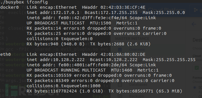 经过信息收集,发现Google Cloud SQL运行数据库服务的容器并非特权容器,执行ifconfig的结果如图3所示: