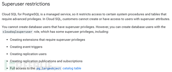 Google提供PostgreSQL服务时的账户为postgres,属于cloudsqlsuperuser角色的一部分。通过查看官方文档,查询该角色拥有的权限如图4所示: