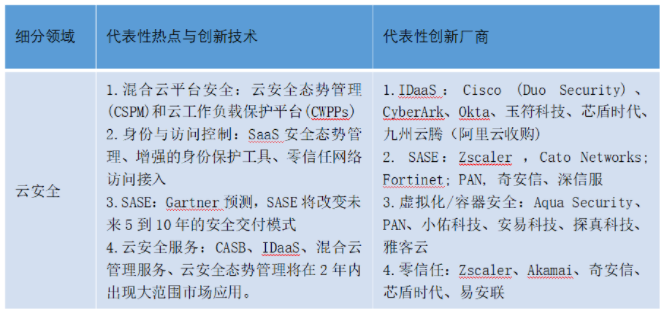 综上,云安全领域代表性的热点与创新技术,以及代表性创新厂商如下表所示: