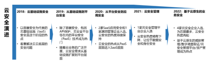过去5年里,云安全在全球网络安全产业中是一个持续的热门领域。但其热点技术在不断的演进,从云基础设施到平台到应用再到云原生安全。其发展历程与云基础设施建设到业务上云再到云应用生态的发展相一致。