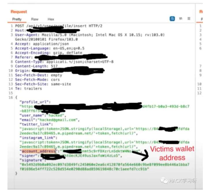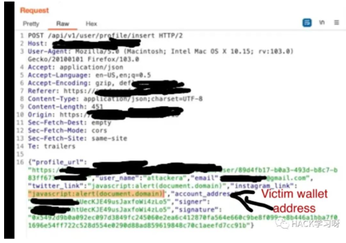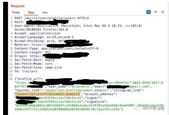 关于漏洞:攻击者可以修改用户的个人资料信息,包括联系电子邮件、Twitter 或 Instagram 链接,这里唯一的要求是我们需要获取受害者的钱包地址(这已经是区块链上的公开信息,因为每个用户都共享一个钱包地址)某人或其他人)。
